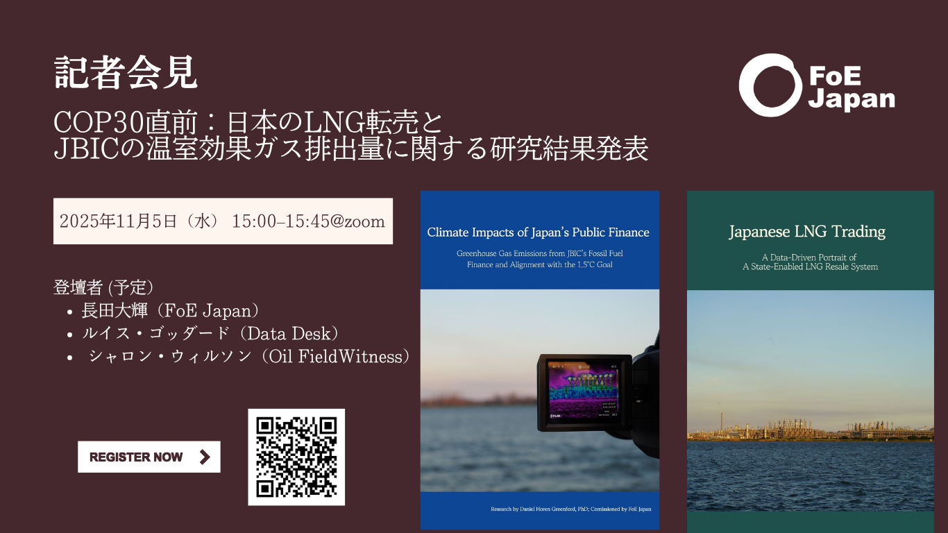 【記者会見のご案内】COP30直前:日本のLNG転売とJBICの温室効果ガス排出量に関する研究結果発表