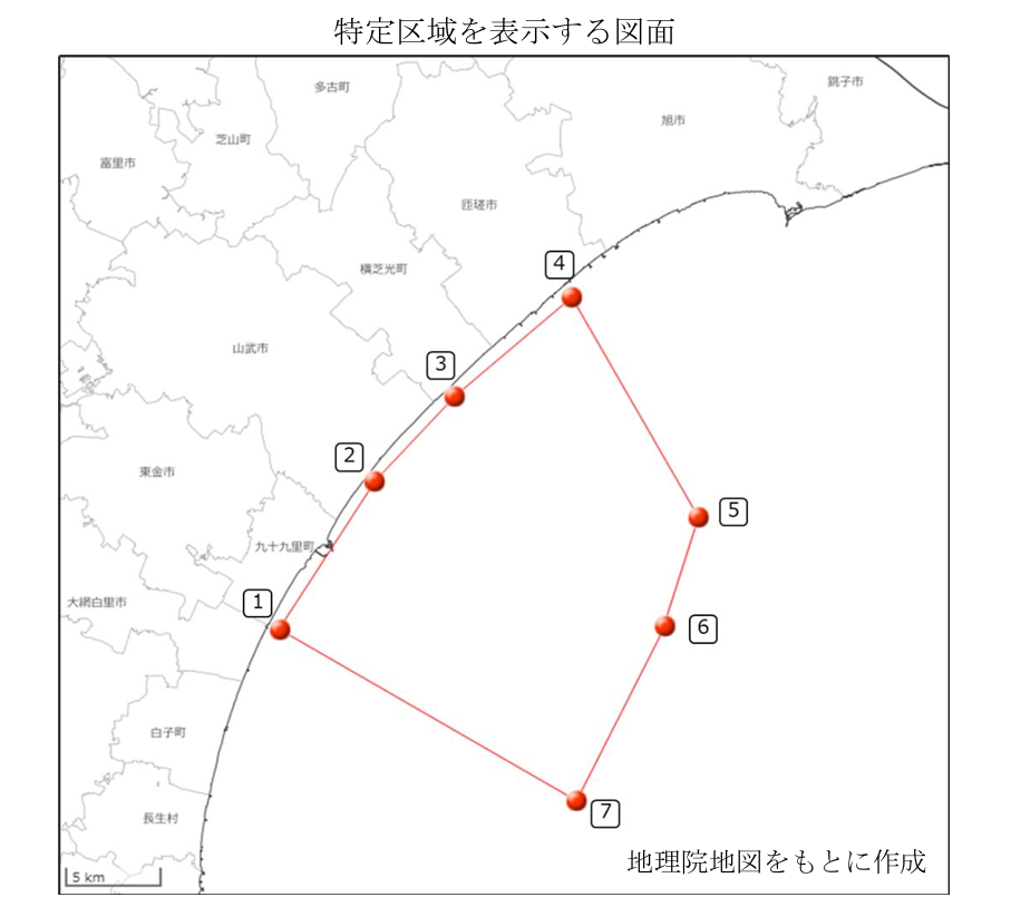 9月17日、経済産業省が九十九里沖で貯留可能性調査のための試掘事業の公募を開始しました。以下が試掘特定区域の図です。九十九里町から匝瑳市に至る範囲の沿岸地域で今後掘削が行われることになります。一度特定地域に指定されたら個別の試掘の許可を取る必要はなく、さらに選定された特定事業者は環境影響評価を行うことも義務付けられていません。