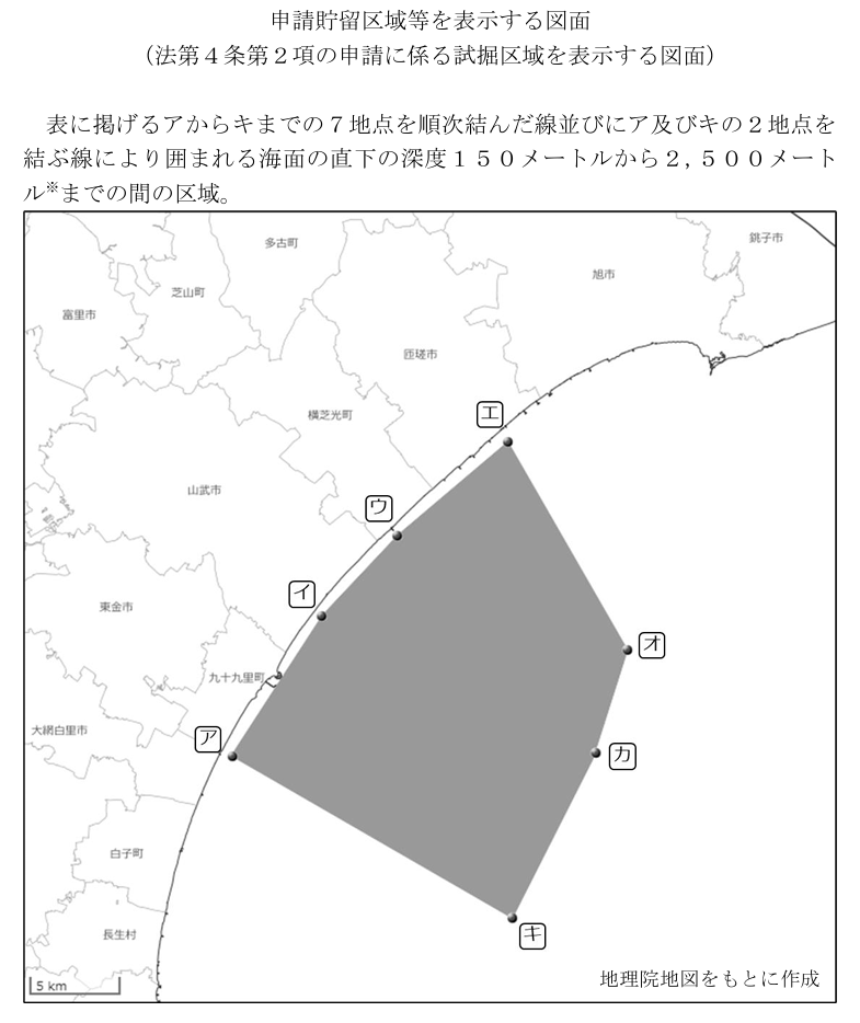 九十九里町から匝瑳市にわたる区域で「海面の直下の深度150メートルから2,500メート ルまでの間」を試掘するとのこと。