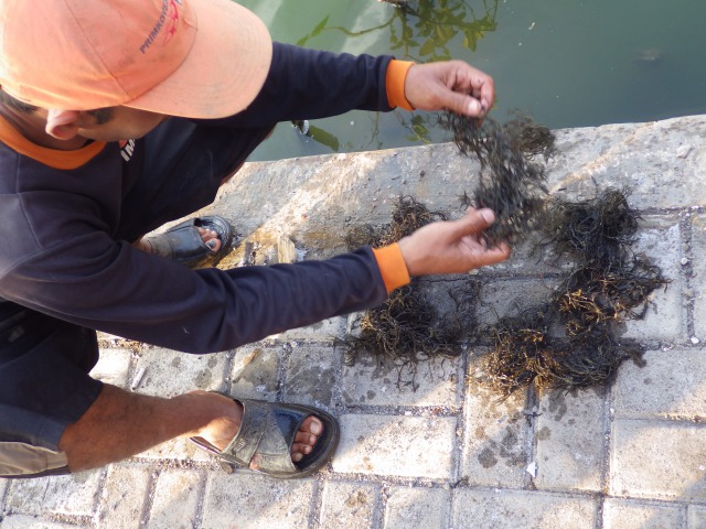 農地の水没により失った収入の代替生計手段として、海草栽培の可能性を検証しています。プカロンガン大学の協力を得て、バンドゥンガン村にて海草の試験栽培を始めました。海草栽培計画や海藻の種類等を住民主体で協議し、2つの養殖場で試験栽培することを決定しました。今年の乾季の長期化はマングローブのみならず海草栽培への影響も懸念されました。水質の変化や塩分濃度が高くなると海藻の成長と収穫量に大きく影響されることから注意深くモニタリングしました。8月には2tの生海草(Rp.275/Kg)を収穫することができました。コミュニティの女性により乾燥を施された海草は、市場で販売されることになりました。農業が出来なくなり働く場所を失っていた女性達は、乾燥作業への参加により1日Rp.30,000の収入を得ることができます。コミュニティ内で栽培した苗のストックをグループで頒布することでより早く普及できると期待されています。